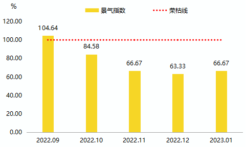 2023年1月,复材产业景气指数在荣枯线下方小幅回升,本期收报66.67点,具体运行情况如下图所示:
