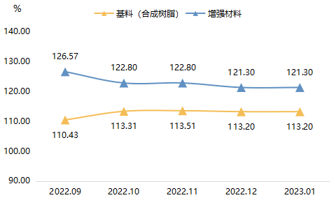 如上图所示,2023年1月,基料和增强材料价格指数分别收报113.20点、121.30点。
