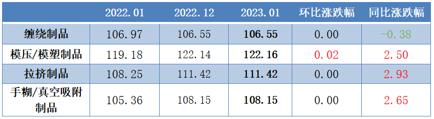 从同比走势看,2023年1月,分工艺复材产品价格指数“三涨一跌”。其中,拉挤制品、手糊/真空吸附制品和模压/模塑制品价格指数分别收报111.42点、108.15点和122.16点,同比分别上行2.93%、2.65%和2.50%;缠绕制品价格指数本期为106.55点,同比下跌0.38%。从环比走势看,本期仅模压/模塑制品价格指数环比上涨0.02%。