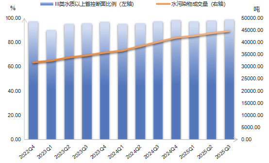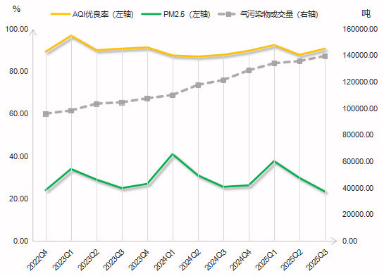 2025年三季度,浙江省III类水质以上省控断面比例为99.00%,空气质量优良率为90.70%,细颗粒物浓度(PM2.5)为23.40微克/立方米。从环境改善情况来看,水污染物成交量(由化学需氧量和氨氮成交量构成)与III类水质以上省控断面比例呈高度正相关关系,显著性水平小于0.01,皮尔逊相关系数为0.906;气污染物成交量(由二氧化硫和氮氧化物成交量构成)与浙江省AQI优良率呈低度正相关关系,显著性水平小于0.01,皮尔逊相关系数为0.443;与PM2.5指数(逆指标)呈低度负相关关系,显著性水平小于0.01,皮尔逊相关系数为-0.475。