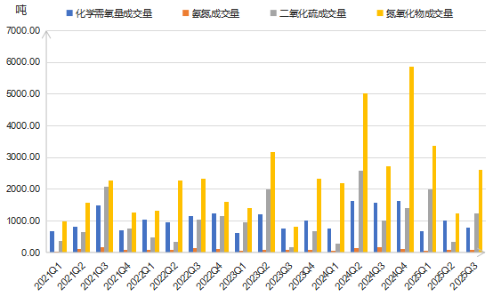 四项排污权成交量:化学需氧量成交量为797.92吨,氨氮成交量为86.08吨,二氧化硫成交量为1250.28吨,氮氧化物成交量为2614.54吨。从环比看,四项主要污染物“三增一降”,其中氨氮、二氧化硫、氮氧化物成交量分别增长1.20%、276.50%、108.22%,化学需氧量成交量则下降21.95%;从同比看,四项主要污染物“一增三降”,其中二氧化硫成交量增长23.88%,化学需氧量、氨氮、氮氧化物成交量则分别下降49.25%、52.48%、3.78%。