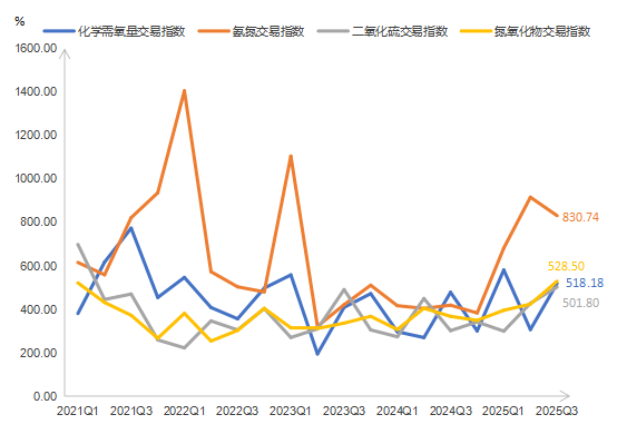 四项排污权指标:化学需氧量交易指数为518.18点,氨氮交易指数为830.74点,二氧化硫交易指数为501.80点,氮氧化物交易指数为528.50点。从环比看,四项主要污染物交易价格指数“三升一降”,化学需氧量、二氧化硫、氮氧化物交易价格指数分别上升69.14%、17.42%、24.84%,氨氮交易价格指数下降9.25%;从同比看,四项主要污染物交易价格指数均有所上升,化学需氧量、氨氮、二氧化硫、氮氧化物交易价格指数分别上升8.46%、98.50%、66.48%、43.94%。