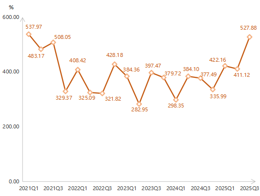 2025年三季度,浙江省排污权交易指数收于527.88点,环比上升28.40%,同比上升39.84%。