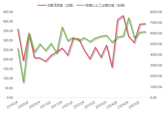 从工业经济指标来看,浙江省排污权交易活跃度与工业增加值(采用浙江省规模以上工业增加值各季度增加值,非累计数)整体呈中度正相关走势,显著性水平小于0.01,皮尔逊相关系数为0.682。