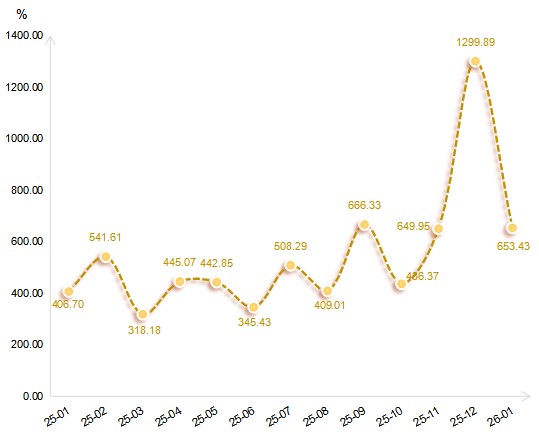 2026年1月,浙江省排污权交易指数收报于653.43点,环比下降49.73%,同比上升60.66%。