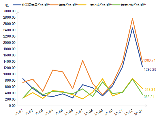 四项排污权指标:化学需氧量交易指数为1236.29点,氨氮交易指数为1386.71点,二氧化硫交易指数为548.31点,氮氧化物交易指数为363.21点。从环比看,四种主要污染物交易价格指数均呈现下降态势,化学需氧量、氨氮、二氧化硫、氮氧化物交易价格指数分别下降50.00%、50.00%、36.66%、57.11%。从同比看,四种主要污染物交易价格指数均呈现上升态势,化学需氧量、氨氮、二氧化硫、氮氧化物交易价格指数分别上升43.60%、87.27%、122.15%、50.21%。