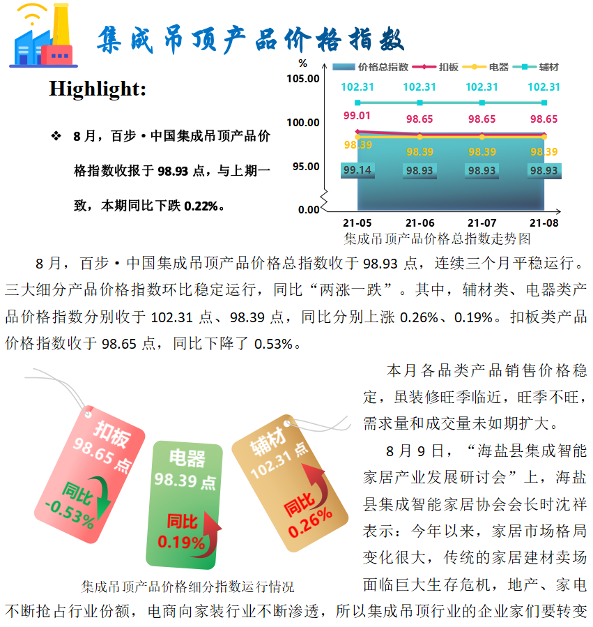 8月,集成吊顶产品价格指数继续平稳运行 | 百步·中国集成吊顶产业指数点评