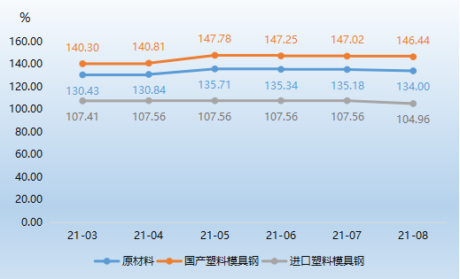 由上图可知,8月,模具原材料价格指数小幅走低,价格指数收报134.00点,环比跌幅为0.87%,但总体来看仍位于较高水平。分市场来看,国产和进口塑料模具钢价格指数均有所下滑。其中,进口塑料模具钢价格走低是原材料价格指数下行的主要原因,8月其价格指数收报104.96点,环比跌幅为2.41%。国产塑料模具钢价格指数8月底收报146.44点,环比跌幅为0.39%。分析来看,8月由于我国钢材价格短期波动及下游模具企业出口订单不足影响,导致模具钢价格指数小幅回落。
