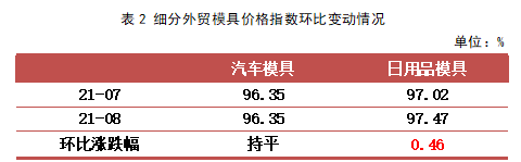 由上表可知,8月,外贸细分品类产品中日用品模具价格指数微幅上涨,收报97.47点,环比上行0.46%,是外贸模具价格总指数上行的主要原因。汽车模具价格指数则保持平稳运行态势,8月收报96.35点,与上期持平。