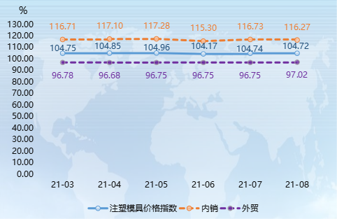 由上图可知,8月,注塑模具价格指数收报104.72点,环比微幅下滑0.02个百分点。分市场来看,内销模具市场产品价格小幅下滑,8月价格指数收报116.27点,环比走低0.39%。整体来看,内销模具市场价格趋于稳定,价格指数在小范围内波动。8月,外贸市场模具价格指数环比上扬,收报97.02点,涨幅为0.28%。分析来看,由于海外疫情影响,全球范围内的缺舱、缺箱情况导致海运费上涨,推动外贸模具价格上浮。