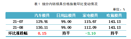 内销模具市场分品类来看,家电模具价格指数有所下滑,8月收报112.09点,环比跌幅为3.10%,是内销模具价格指数下滑的主要原因。内销汽车模具价格则小幅上涨,8月其价格指数收报130.11点,环比涨幅为0.15%。日用品和吹瓶模具价格指数均与上期持平。