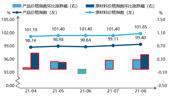 8月以来,受玻璃大宗商品价格高位运行影响,浦江水晶产业原材料和水晶产品不敌上游涨价压力,小幅加价经营。8月,浦江水晶产品和原材料价格指数分别收报于99.40点、101.85点,环比分别上涨0.29%、0.45%,指数具体走势如图一所示。