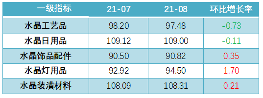 从水晶产品价格指数运行情况看,五个细分品类价格指数“三涨两跌”。其中,水晶饰品配件、水晶灯用品和水晶装潢材料本期分别收于90.82点、94.50点和108.31点,环比分别上涨了0.35%、1.70%和0.21%。水晶工艺品、水晶日用品价格指数本期分别收于97.48点和109.00点,环比分别下降了0.73%、0.11%。五大分类产品价格指数涨多跌少,本期浦江水晶产品价格指数总体表现为小幅上行,指数具体走势如表1所示。