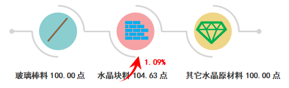 从水晶原材料价格指数运行情况看,三个细分品类价格指数“一涨两平”。受工艺玻璃价格指数上涨影响,本期水晶块料价格指数收于104.63点,较上期上涨了1.09%。玻璃棒料和其它水晶原材料价格指数与上期一致。