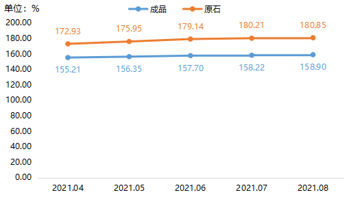 细分市场来看,如图二所示,8月各大玉种原石、成品价格指数均有上涨,其中独山玉原石、成品价格指数环比分别上涨1.22%、1.07%,是推动8月玉雕成品、原石价格延续涨势的主要原因。