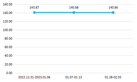 从周价格指数运行情况来看:2023年1月,远洋鱿鱼价格指数小幅下滑,波动较小,1月内指数累计下滑0.21个百分点。第一周,远洋鱿鱼价格指数收于140.87点;第二周小幅下跌至140.68点,较上一周下跌0.19个百分点,为1月内最大跌幅;随后由于农历春节到来,市场交易数据暂停,最后一周,指数继续下行,最终收于140.66点。