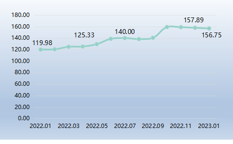 2023年1月,中国远洋鱿鱼价格指数继续在高位小幅下行,收于156.75点,环比下跌0.72%,跌幅较上期(0.69%)扩大了0.03个百分点。