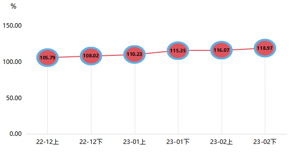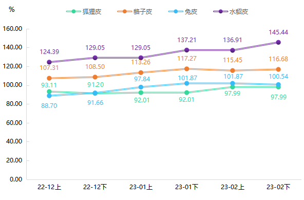 2023年2月下半月,裘皮价格指数在上涨通道延续前期上行走势,本月指数持续上涨,具体运行情况如下图所示: