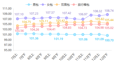 女包价格跌后上涨,涨至下半年以来的峰值108.74点,环比上涨0.39%。电商活动“双十二”过后,女包这一类目产品价格明显回升,其细分产品价格全面上涨。旅行箱包价格连续三期上涨,指数收于105.02点,环比上涨0.04%,跌幅较上期有所扩大。但总体来看,旅行箱包产品价格下半年以来的上升趋势依旧明显。