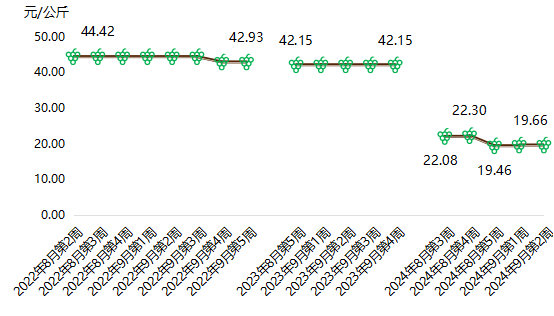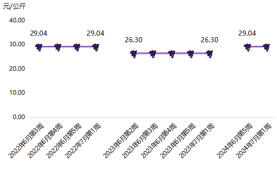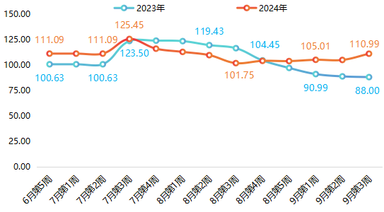 浦江葡萄价格指数每年6月至9月发布,期间每周发布一次。2024年,浦江葡萄价格指数总体高于2023年,且波动幅度较小。6月第5周,浦江葡萄价格指数收报111.09点,与2023年同期相比上涨10.39%。7月第3周,浦江葡萄价格指数达到年内最高点125.45点。此后,指数开始持续下降,8月第3周指数收于年内最低点101.75点。9月第3周,浦江葡萄价格指数以110.99点收盘,同比上涨26.13%。