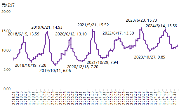 据中国农业信息网数据,全国巨峰葡萄平均批发价走势具有明显的周期性。每年上半年,巨峰葡萄价格单边上涨,于6月前后,巨峰葡萄价格达阶段性高位之后持续回落,并于12月左右收于相对低位。
