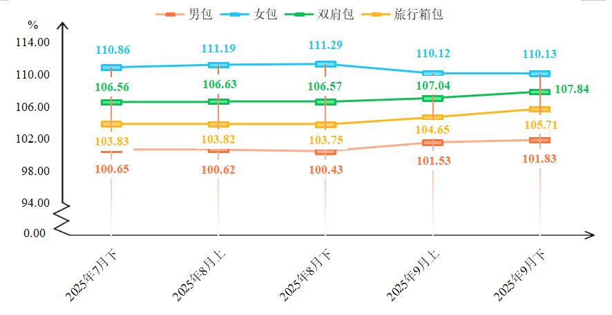 9月下半月,四类细分产品价格指数全面回升。其中,旅行箱包和双肩包成为增长主力,价格指数分别收于105.71点和107.84点,环比分别上涨1.01%和0.75%;男包价格指数涨势次之,收于101.83点,环比上涨0.30%;女包价格指数基本平稳运行,收于110.13点,较上期高出0.01个百分点。
