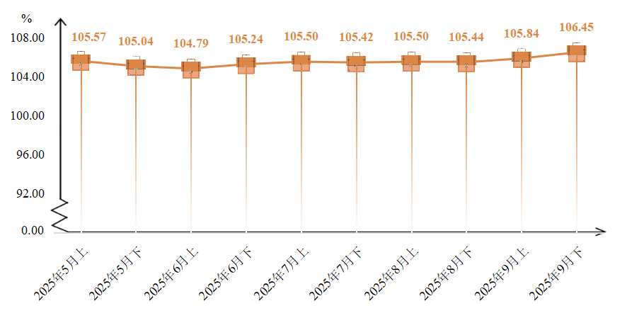 据“白沟·中国箱包指数”信息系统监测,2025年9月下半月,箱包产品价格指数延续上行走势,收于106.45点,环比涨幅0.58%,创下2025年以来最高值,显示“金九银十”传统旺季效应持续释放。