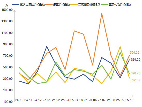 四项排污权指标:化学需氧量交易指数为629.20点,氨氮交易指数为704.22点,二氧化硫交易指数为312.93点,氮氧化物交易指数为390.75点。从环比看,四种主要污染物交易价格指数呈现“两升两降”态势,其中化学需氧量、氨氮交易价格指数均上升100.00%,二氧化硫、氮氧化物交易价格指数则分别下降63.54%、48.43%。从同比看,四种主要污染物交易价格指数同样呈现“两升两降”态势,其中化学需氧量、氨氮交易价格指数分别上升142.65%、78.56%,二氧化硫、氮氧化物交易价格指数则分别下降22.61%、21.28%。