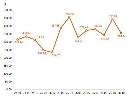 2025年10月,浙江省排污权交易活跃度指数收报于355.34点,环比下降20.09%,同比上升12.65%。