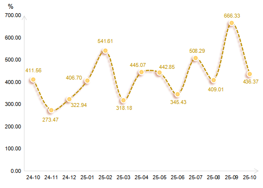 2025年10月,浙江省排污权交易指数环比、同比“一降一升”。指数收报于436.37点,环比下降34.51%,同比上升6.03%。