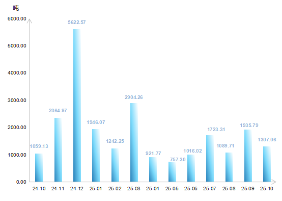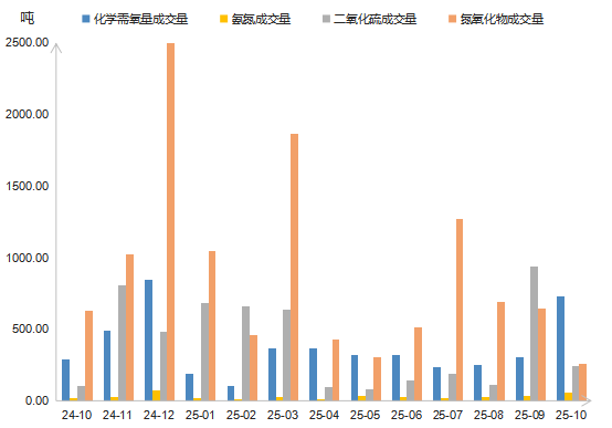 2025年10月,四项排污权总成交量环比、同比“一降一升”,成交量达1307.06吨,环比下降32.48%,同比增长23.41%。