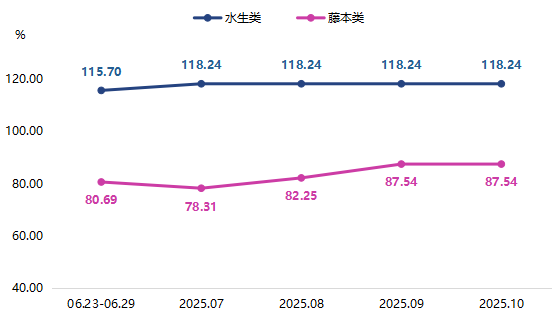 2025年10月,水生类、藤本类产品价格指数分别保持在118.24点和87.54点稳定运行,无明显变化。具体运行情况如下图所示: