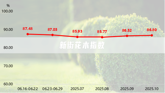 随着天气逐渐转凉,苗木移栽存活率上升,花木市场处于传统销售旺季。同时,现阶段也是下半年绿化工程实施的理想时间点,随着大多数绿化项目推进至关键施工期,对苗木的需求也有所增加,推动价格指数稳中有升。据“中国·萧山新街花木指数”信息系统监测,2025年10月,新街花木产品价格指数收于86.80点,环比上涨0.28点。具体运行情况如下图所示: