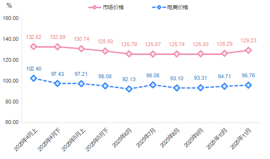 电商价格指数延续涨势。11月,电商价格指数收于95.76点,环比上涨1.11%。细分品类中,西瓜菠萝成为电商市场最大亮点,价格指数环比上涨4.78%,收于78.21点,其口感清甜、适合榨汁等产品特性,在“双十一”健康饮品原料促销中销量增加。巴厘菠萝和小菠萝作为大众消费主力品种,电商平台通过“秒杀”“拼团”等策略,在价格小幅上涨的同时实现销量同比增长。