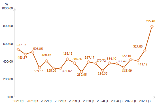 2025年四季度,浙江省排污权交易指数收于795.40点,环比上升50.68%,同比上升136.73%。
