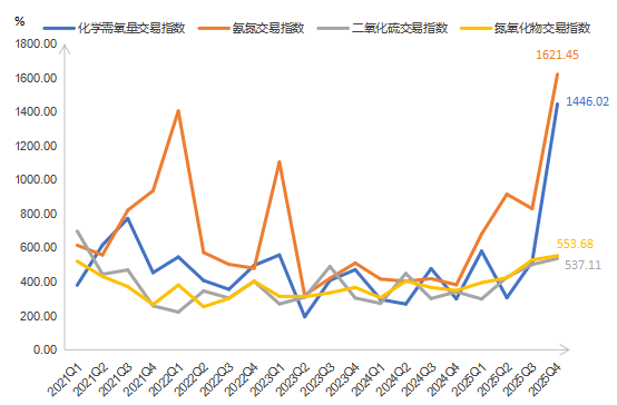 四项排污权指标:化学需氧量交易指数为1446.02点,氨氮交易指数为1621.45点,二氧化硫交易指数为537.11点,氮氧化物交易指数为553.68点。从环比看,四项主要污染物交易价格指数均呈现上升趋势,化学需氧量、氨氮、二氧化硫、氮氧化物交易价格指数分别上升179.06%、95.18%、7.04%、4.77%;从同比看,四项主要污染物交易价格指数也均有所上升,化学需氧量、氨氮、二氧化硫、氮氧化物交易价格指数分别上升382.07%、323.78%、57.39%、58.81%。