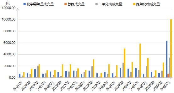 2025年四季度,浙江省排污权四项污染物成交量合计为20580.39吨,环比增长333.38%,同比增长127.49%。