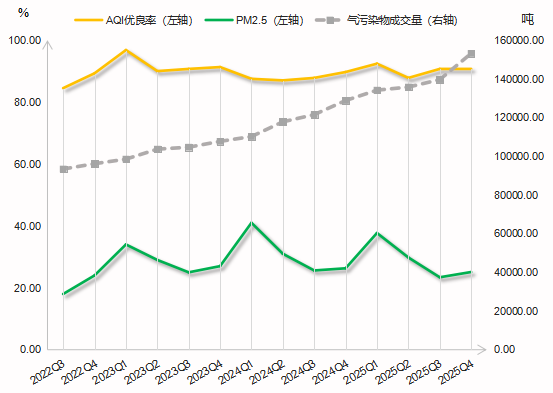 2025年四季度,浙江省III类水质以上省控断面比例为99.70%,空气质量优良率为90.90%,细颗粒物浓度(PM2.5)为25.10微克/立方米。从环境改善情况来看,水污染物成交量(由化学需氧量和氨氮成交量构成)与III类水质以上省控断面比例呈高度正相关关系,显著性水平小于0.01,皮尔逊相关系数为0.899;气污染物成交量(由二氧化硫和氮氧化物成交量构成)与浙江省AQI优良率呈低度正相关关系,显著性水平小于0.01,皮尔逊相关系数为0.436;与PM2.5 指数(逆指标)呈低度负相关关系,显著性水平小于0.01,皮尔逊相关系数为-0.487。